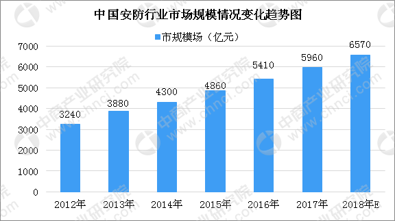 中商情報網訊: 近年來,國内安防行(xíng)業(yè)市場(chǎng)規模保持穩定增長,其市場(chǎng)前景可(kě)期。據中商産業(yè)研究院發布的(de)《2018-2023年中國安防行(xíng)業(yè)市場(chǎng)前景及投資機會(huì)研究報告》數據統計(jì)顯示:我國安防行(xíng)業(yè)市場(chǎng)規模從2012年的(de)3240億元增長到(dào)2017年的(de)5960億元,年均複合增長率達到(dào)13%。據中商産業(yè)研究院數據預測,2018年,我國安防行(xíng)業(yè)市場(chǎng)規模将達到(dào)6570億元。
